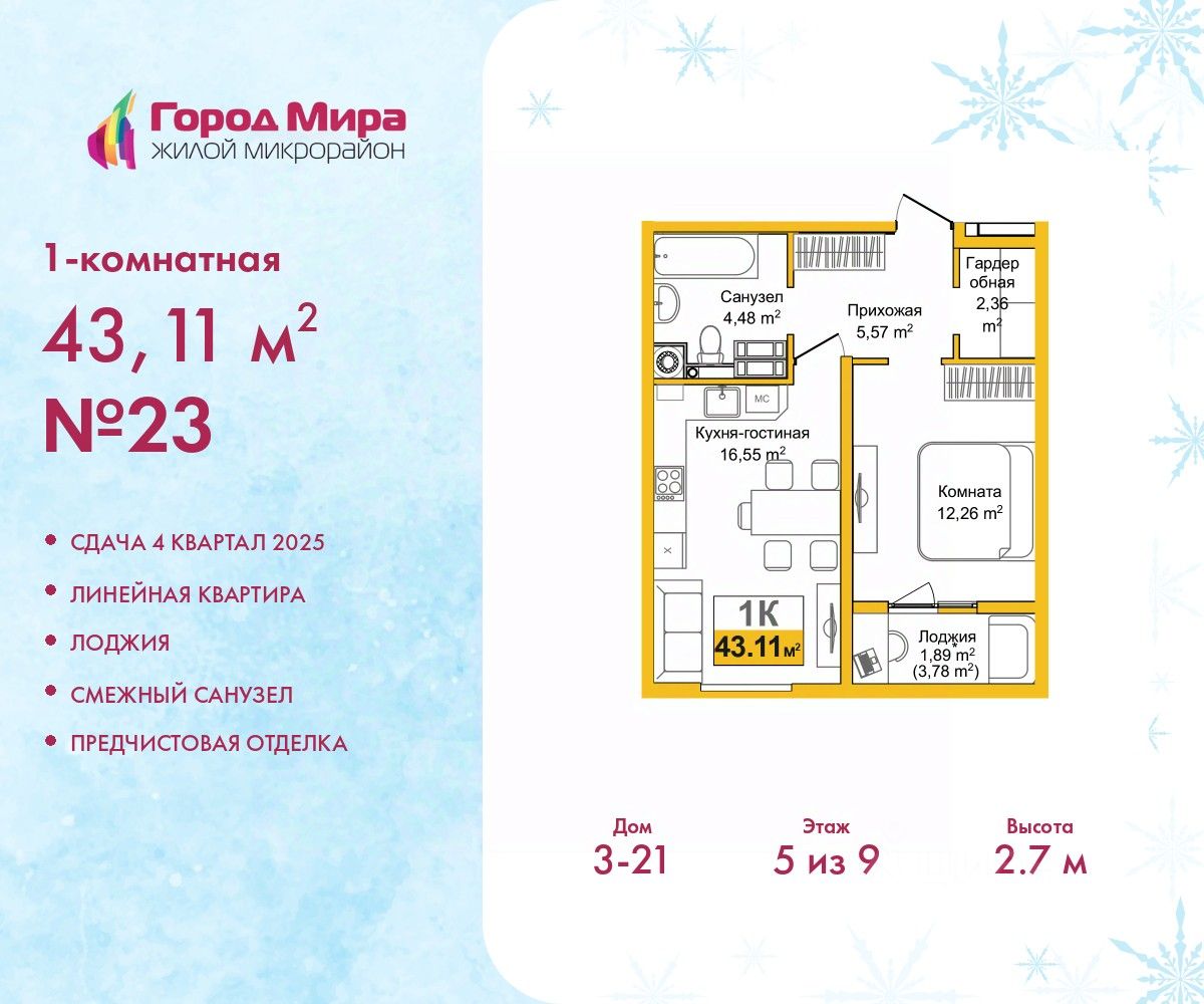 Однокомнатная квартира с предчистовой отделкой в ЖМ ''Город Мира'' на 5 этаже. Общая площадь: 43.11 кв.м., жилая: 12.26 кв.м., площадь просторной кухни-столовой: 16.55 кв.м. Все окна выходят на одну сторону. В квартире одна лоджия, один совмещенный санузел. Высота потолков 2.7 м.