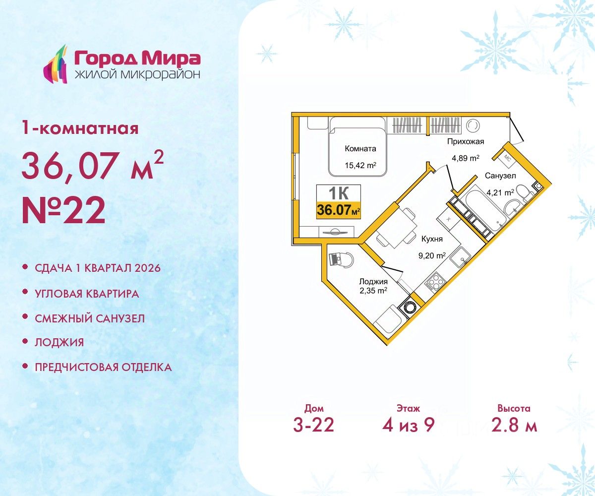 1-комн. квартира с предчистовой отделкой в ЖМ ''Город Мира'' на 4 этаже. Общая площадь: 36.07 кв.м., жилая: 15.42 кв.м., площадь просторной кухни-столовой: 9.2 кв.м. Квартира угловая, идеально подойдет любителям тишины и панорамных видов. В квартире одна лоджия, один совмещенный санузел. Высота потолков 2.8 м.