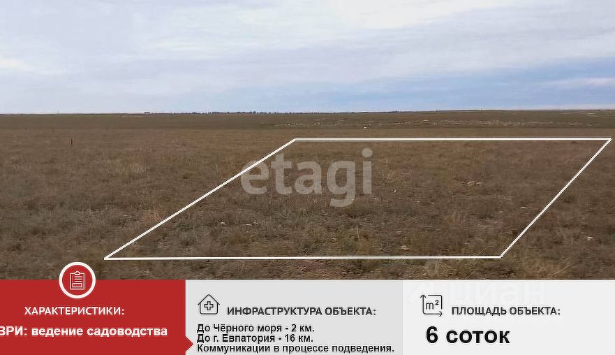 До г. Евпатория 24 км (10-15 мин на машине). До моря 4 км. Асфальт до ЗУ, примыкает к границе населенного пункта. До озера Донузлав - 5 км.