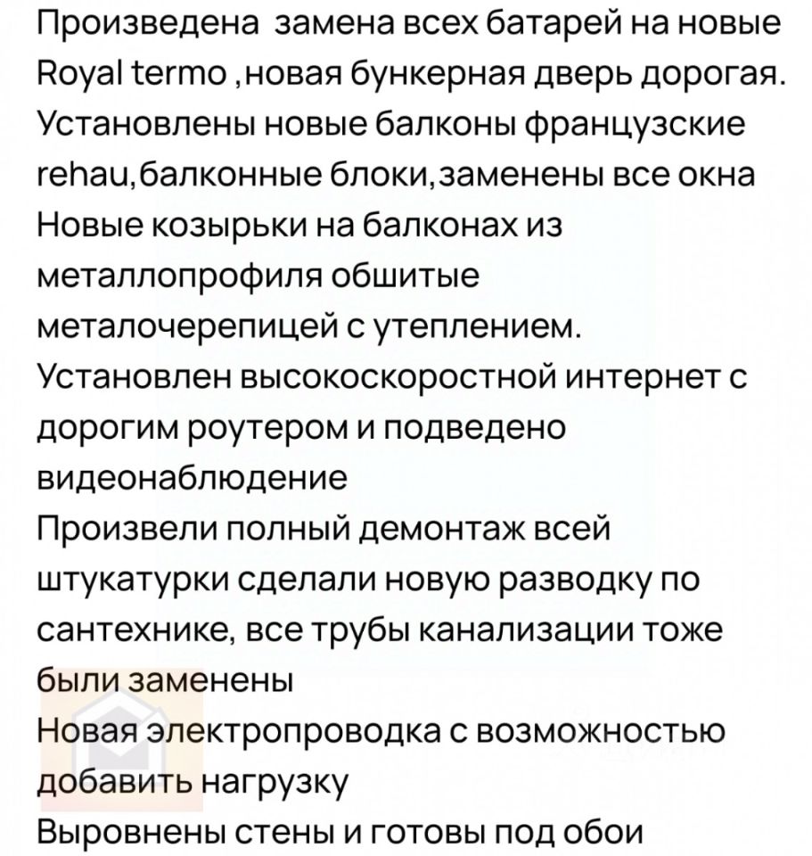 В продаже трёхкомнатная квартира после капитального ремонта. В квартире заменено буквально всё, вся сантехника(трубы в сан.узле и трубы стояков отопления), канализация, электрика(установлены новые розетки и выключатели, установлен новый распределительный блок с автоматами на электричество), радиаторы отопления, стеклопакеты (оконные и балконные блоки полностью заменены, на балконах установлены новые козырьки с утеплением) все стены оштукатурены по новой выровнены и подготовлены к поклейке обоев.(есть фото проделанных работ). установлена новая качественная дверь, установлен новый роутер и проведен высокоскоростной интернет, установлено наружное видеонаблюдение. В квартире остаются: новая кровать с ортопедическим основанием и матрацем, новый роутер, новые холодильник и стиральная машина. Между квартирой и крышей есть тех. этаж, выполнен ремонт крыши. Квартира находится в тихом спальном районе, в пешей доступности вся городская и социальная инфраструктура.