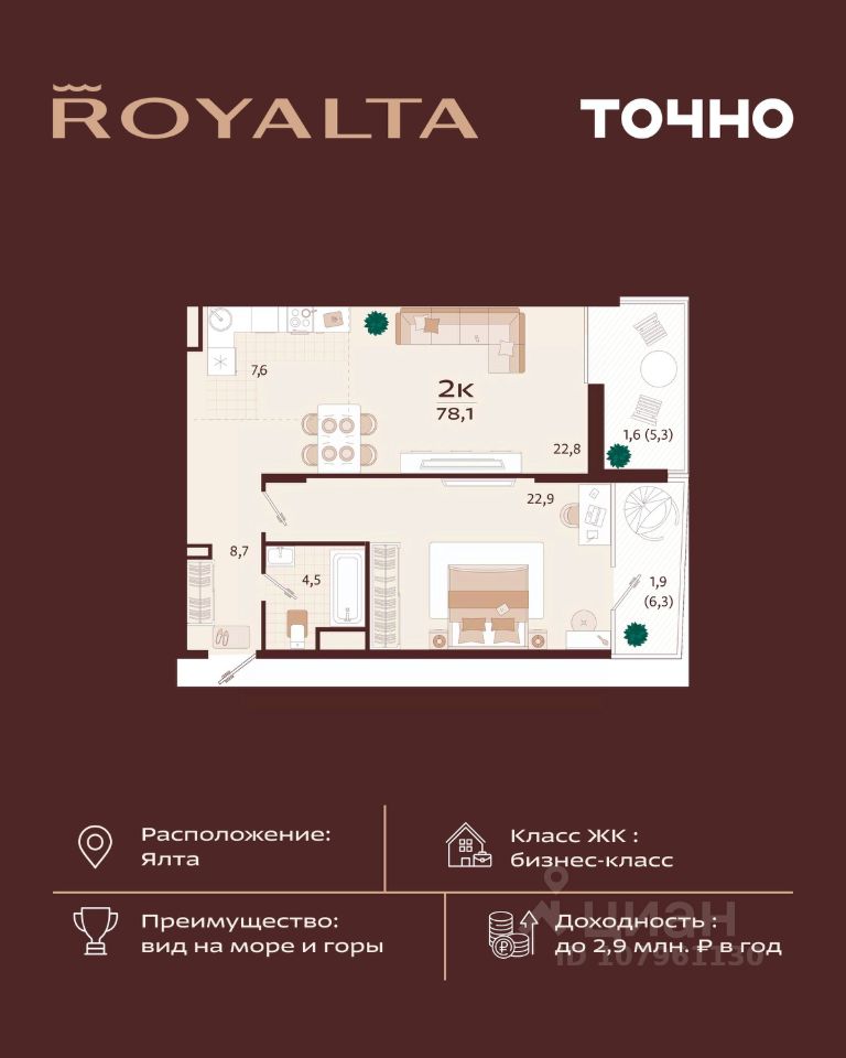 Жилой комплекс ''РОЯЛТА'' включает 5 монолитно-кирпичных девятиэтажных зданий. Проект предлагает квартиры различных планировок: от однокомнатных до трехкомнатных с расширенными балконами и террасами до 13,4 м2. Территория будет благоустроена детскими игровыми и спортивными площадками, гостевой автостоянкой и озеленением, включая газоны, деревья и кустарники. Также появятся современные уличные тренажёры, СПА-комплекс и панорамный инфинити-бассейн. В шаговой доступности находятся центральная набережная Ялты, детские сады, школы, супермаркеты, торговые центры, Ялтинский медицинский колледж, автовокзал и Мордвиновский парк.
