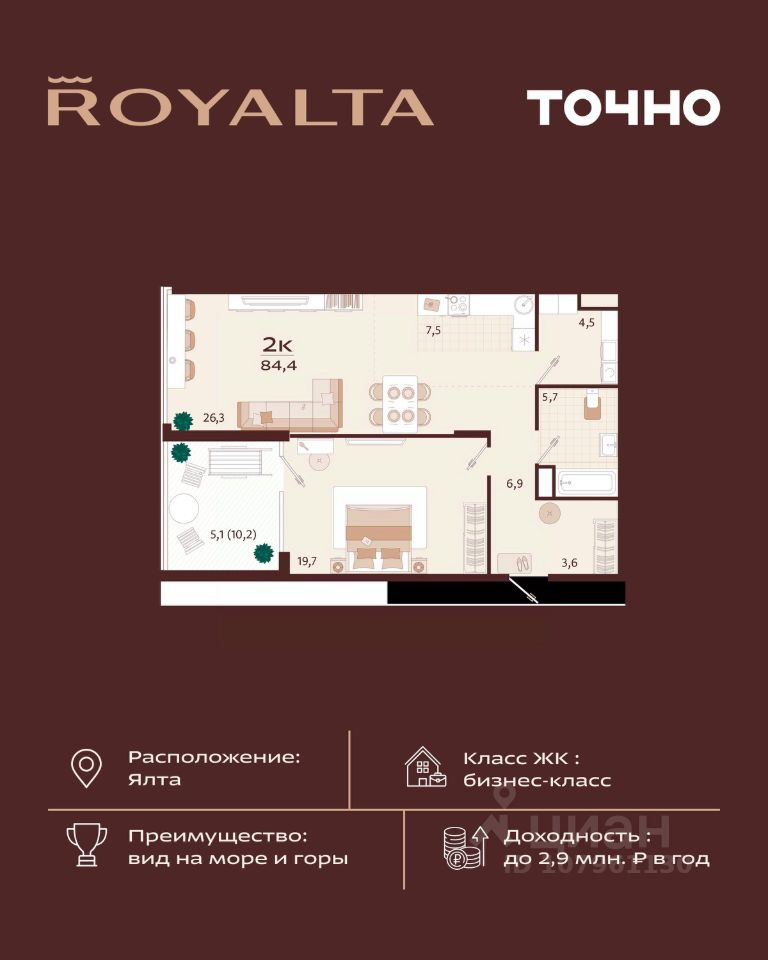 Жилой комплекс ''РОЯЛТА'' включает 5 монолитно-кирпичных девятиэтажных зданий. Проект предлагает квартиры различных планировок: от однокомнатных до трехкомнатных с расширенными балконами и террасами до 13,4 м2. Территория будет благоустроена детскими игровыми и спортивными площадками, гостевой автостоянкой и озеленением, включая газоны, деревья и кустарники. Также появятся современные уличные тренажёры, СПА-комплекс и панорамный инфинити-бассейн. В шаговой доступности находятся центральная набережная Ялты, детские сады, школы, супермаркеты, торговые центры, Ялтинский медицинский колледж, автовокзал и Мордвиновский парк.