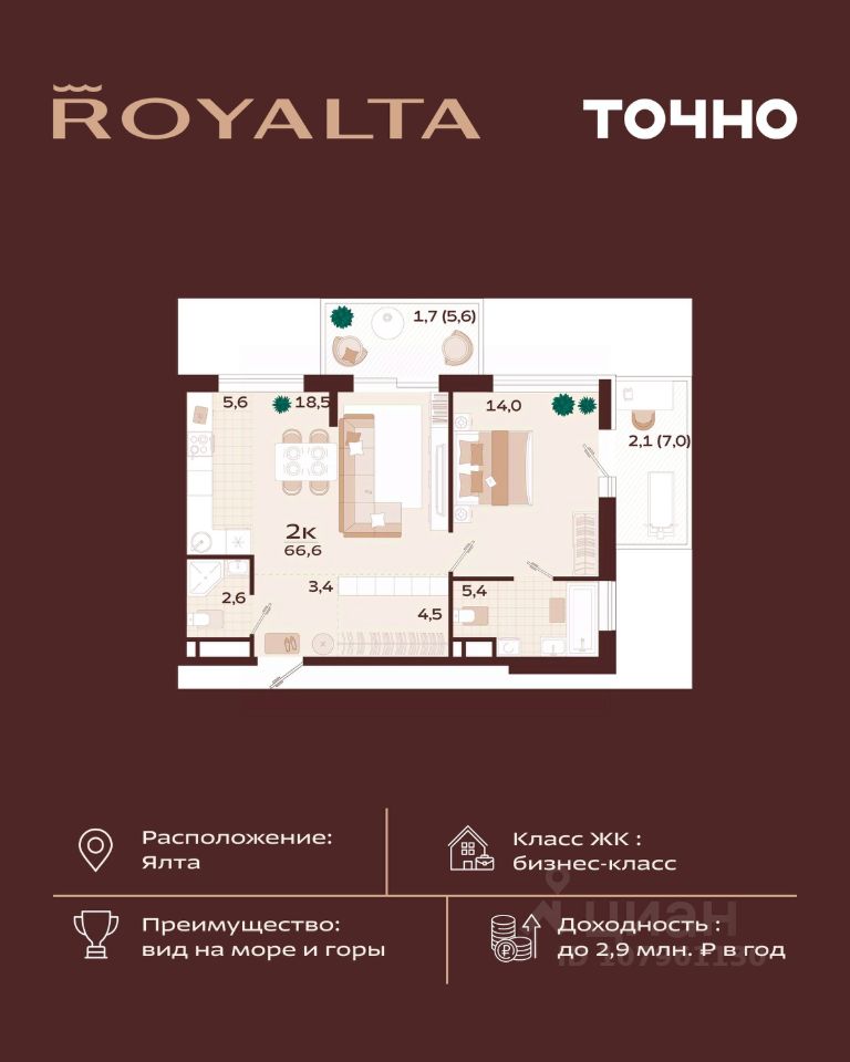 Жилой комплекс ''РОЯЛТА'' включает 5 монолитно-кирпичных девятиэтажных зданий. Проект предлагает квартиры различных планировок: от однокомнатных до трехкомнатных с расширенными балконами и террасами до 13,4 м2. Территория будет благоустроена детскими игровыми и спортивными площадками, гостевой автостоянкой и озеленением, включая газоны, деревья и кустарники. Также появятся современные уличные тренажёры, СПА-комплекс и панорамный инфинити-бассейн. В шаговой доступности находятся центральная набережная Ялты, детские сады, школы, супермаркеты, торговые центры, Ялтинский медицинский колледж, автовокзал и Мордвиновский парк.