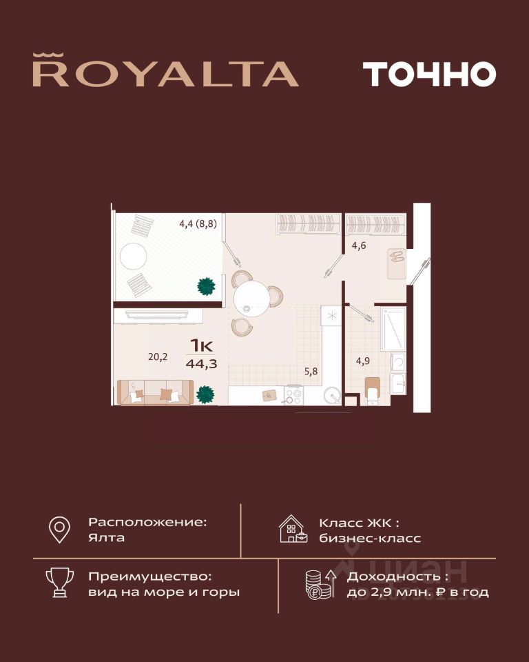 Жилой комплекс ''РОЯЛТА'' включает 5 монолитно-кирпичных девятиэтажных зданий. Проект предлагает квартиры различных планировок: от однокомнатных до трехкомнатных с расширенными балконами и террасами до 13,4 м2. Территория будет благоустроена детскими игровыми и спортивными площадками, гостевой автостоянкой и озеленением, включая газоны, деревья и кустарники. Также появятся современные уличные тренажёры, СПА-комплекс и панорамный инфинити-бассейн. В шаговой доступности находятся центральная набережная Ялты, детские сады, школы, супермаркеты, торговые центры, Ялтинский медицинский колледж, автовокзал и Мордвиновский парк.