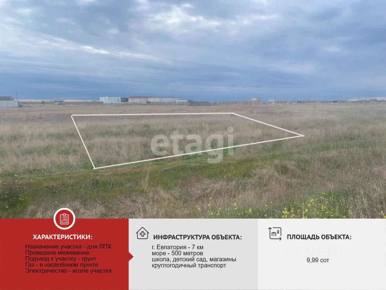 До Евпатории 7 км. Участок находится в хорошо развитом курортном поселке, до моря пешком 5 минут, 500 метров.