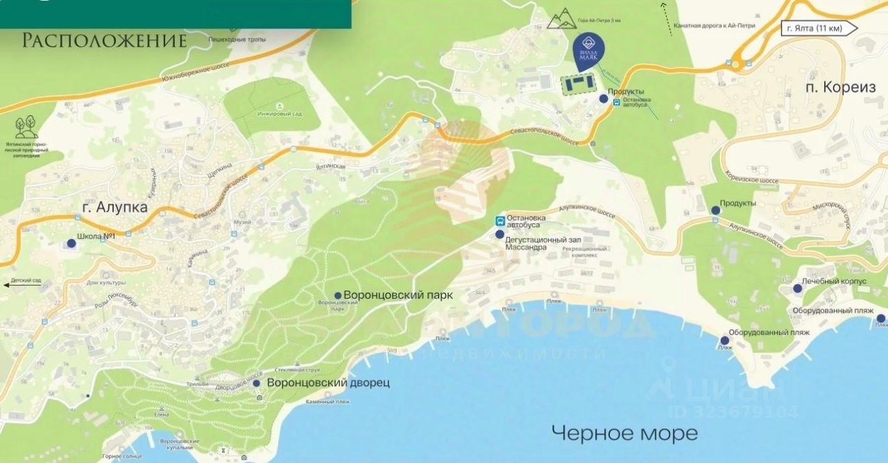 Рядом Воронцовский парк и дворец графа Воронцова, в комфортной доступности Ялтинский горно-лесной заповедник, Крепость Алупка-Исар, канатная дорога Мисхор Ай-Петри, различные пляжи.