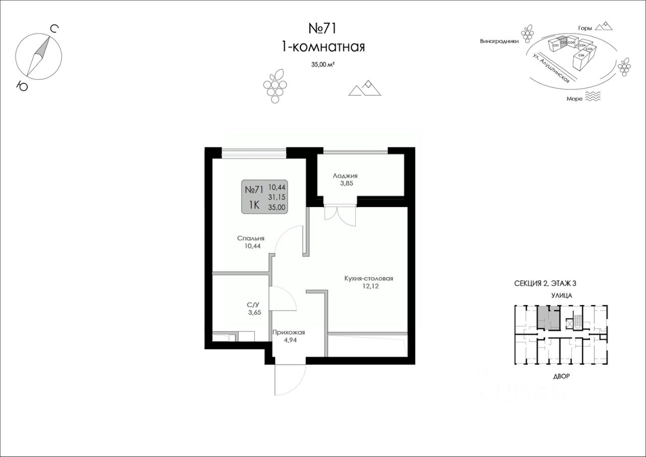 Продаётся 1-комнатная квартира в строящемся доме (Строение 1), срок сдачи: I-кв. 2027, общей площадью 35 кв.м., на 3 этаже.