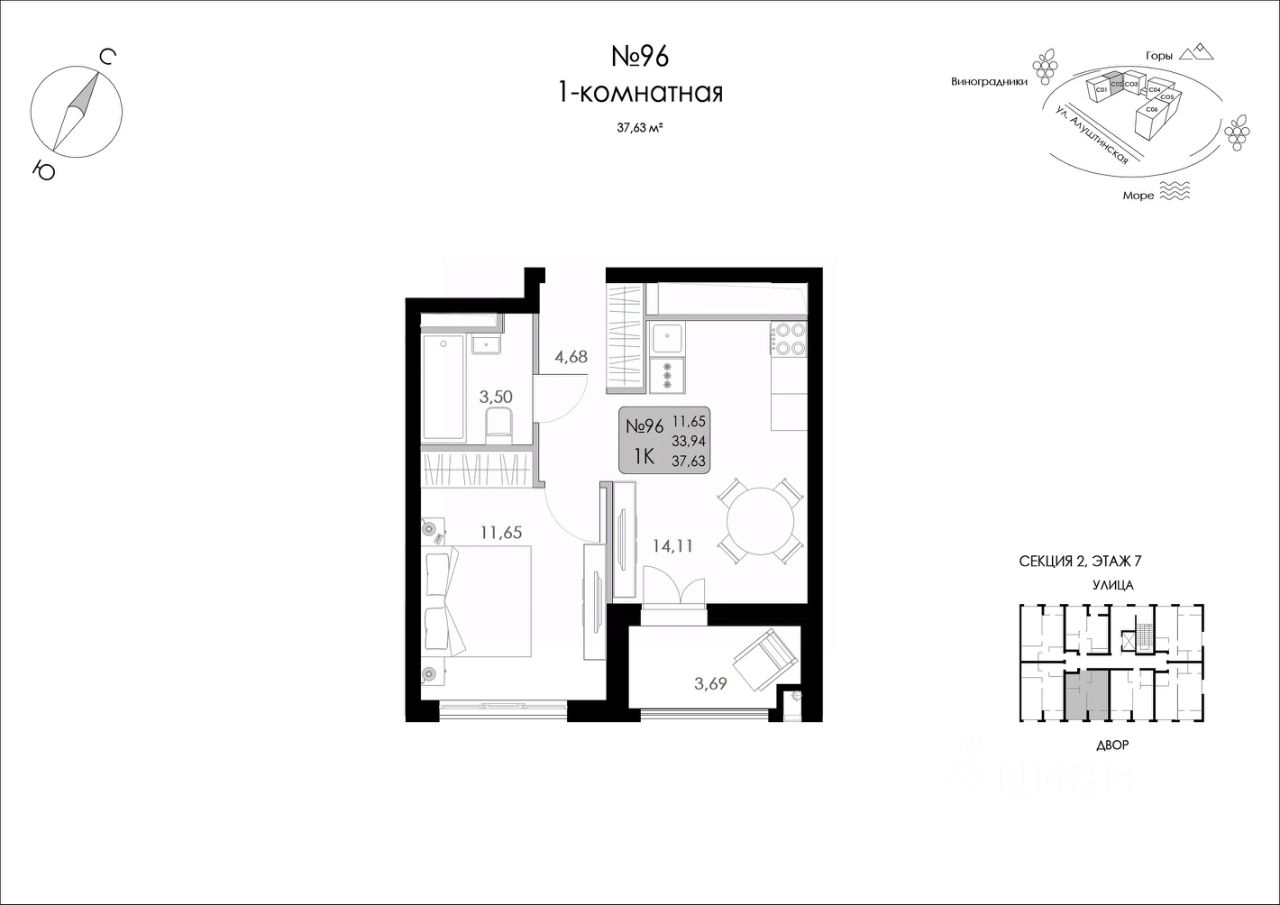 Продаётся 1-комнатная квартира в строящемся доме (Строение 1), срок сдачи: I-кв. 2027, общей площадью 37.63 кв.м., на 7 этаже.