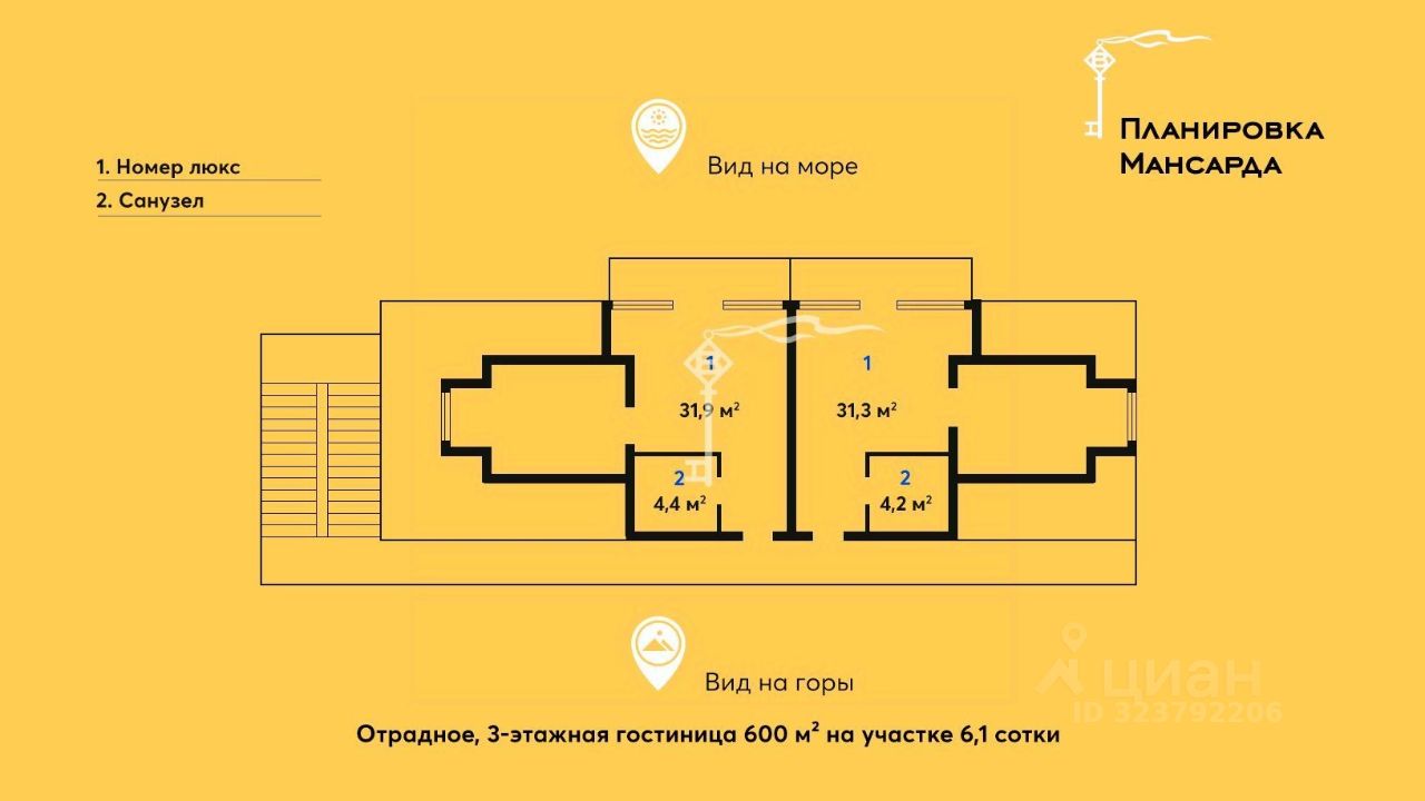 Продажа мини-отеля на десять номеров площадью 600 м² на благоустроенном участке 6,1 соток в живописном поселке Отрадное в 500 метрах от моря.
