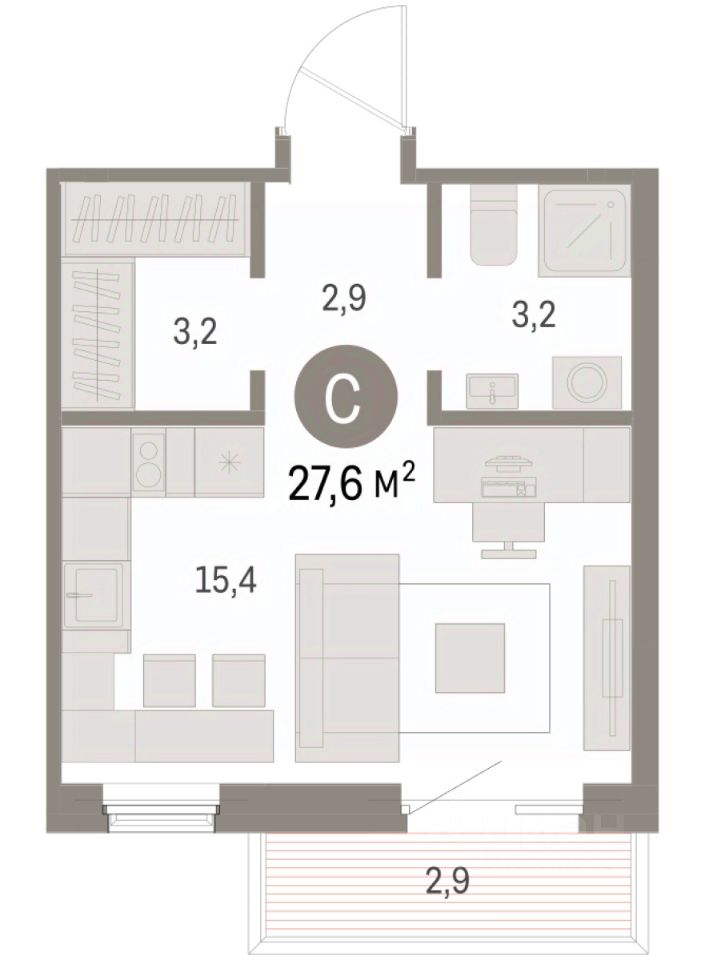 Просторная 1-комн. студия с предчистовой отделкой в ЖК ''Дом Кино'' на 8 этаже. Общая площадь: 27.57 кв.м., площадь гостиной 15.4 кв.м., из которых 5 кв.м. выделено под кухонную зону. Все окна выходят на одну сторону. В квартире один балкон, один совмещенный санузел. Высота потолков 2.7 м.
