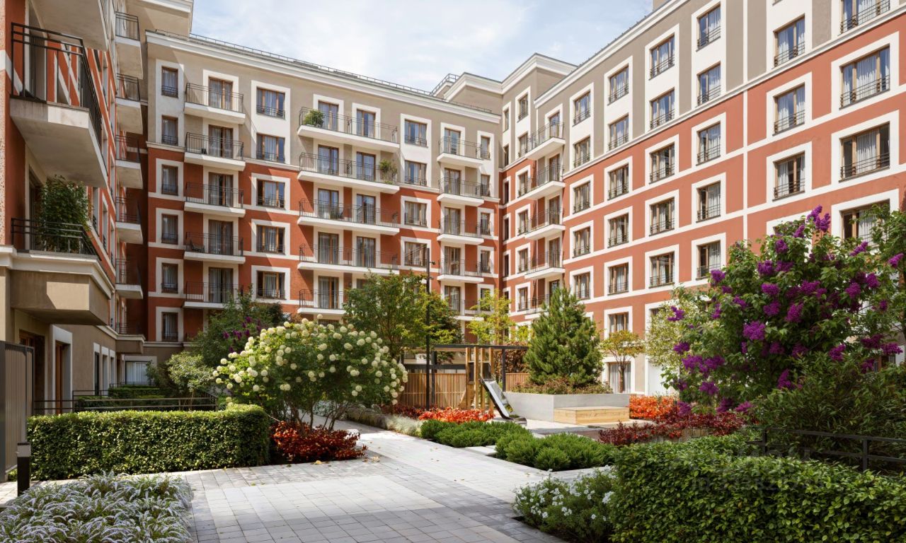 Двор с выходом в сквер Двор - это приватное пространство для жителей, закрытое от машин. В нём спроектированы детская и спортивная площадки, выполненные из натуральных материалов, а также зоны отдыха. Прямой выход в городской сквер расширяет функционал двора. Жители смогут быстро попадать в общественную зону с фонтаном, детскими и спортивными площадками и местами для отдыха. Большую часть территории двора занимает зелень. Озеленение выполнено в стиле пэчворк, и вдохновлено техникой лоскутного шитья. Отдельные фрагменты ландшафта, подобно лоскутам, гармонично складываются в планировочные элементы, а затем формируют цельную композицию. Растения представлены различными видами деревьев, кустарников, а также цветущими многолетниками. Зелень и стены