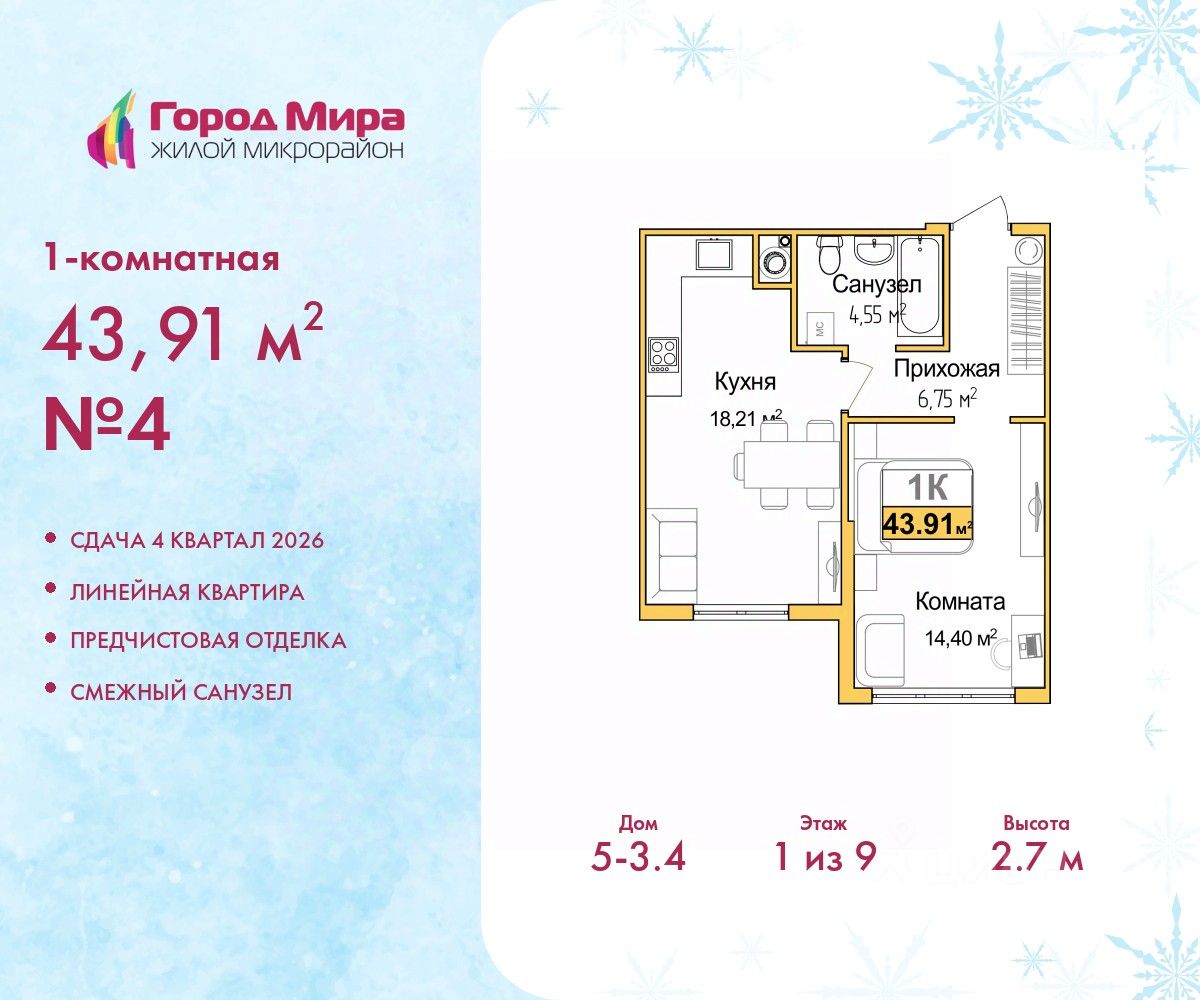 Просторная однокомнатная квартира с предчистовой отделкой в ЖМ ''Город Мира'' на 1 этаже. Общая площадь: 43.91 кв.м., жилая: 14.4 кв.м., площадь просторной кухни-столовой: 18.21 кв.м. Все окна выходят на одну сторону. В квартире один совмещенный санузел. Высота потолков 2.7 м.