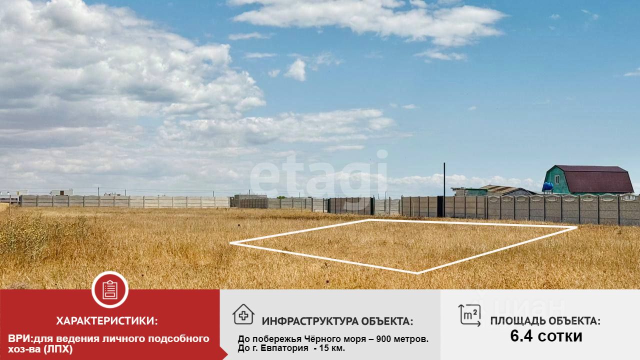 До г. Евпатория 15 км (10-15 мин на машине). До моря 800 метров. Асфальт до ЗУ, примыкает к границе населенного пункта.