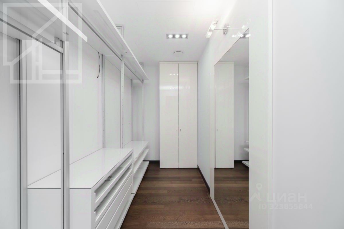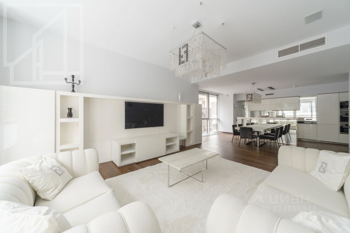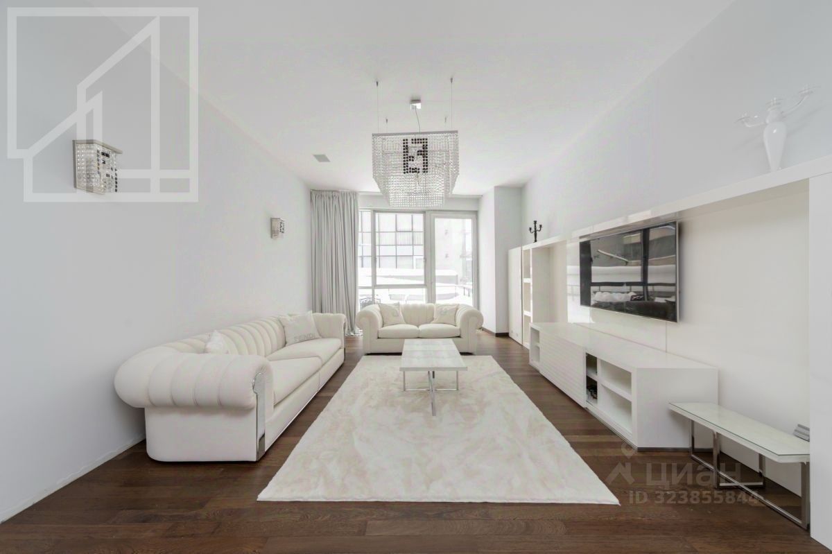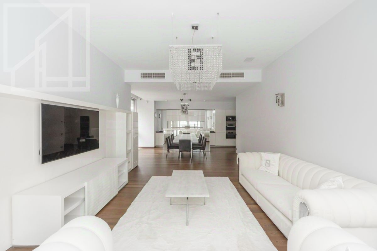 Планировка: гостиная 64 м² с зоной кухни, спальня с ванной комнатой, вторая спальня, санузел, гардеробная комната, постирочная, холл. Выполнен дизайнерский ремонт с использованием натурального дерева. Интерьер оформлен в светлых тонах. Высокие потолки украшены авторскими люстрами от Fendi с декором из стекла. Квартира полностью меблирована, в гостиной зона отдыха с мягкими белыми диванами от Fendi. Оборудована кухня со встроенной бытовой техникой Miele и столовой зоной на 5 персон. Из гостиной и спальни предусмотрен выход на просторную террасу 30 м².