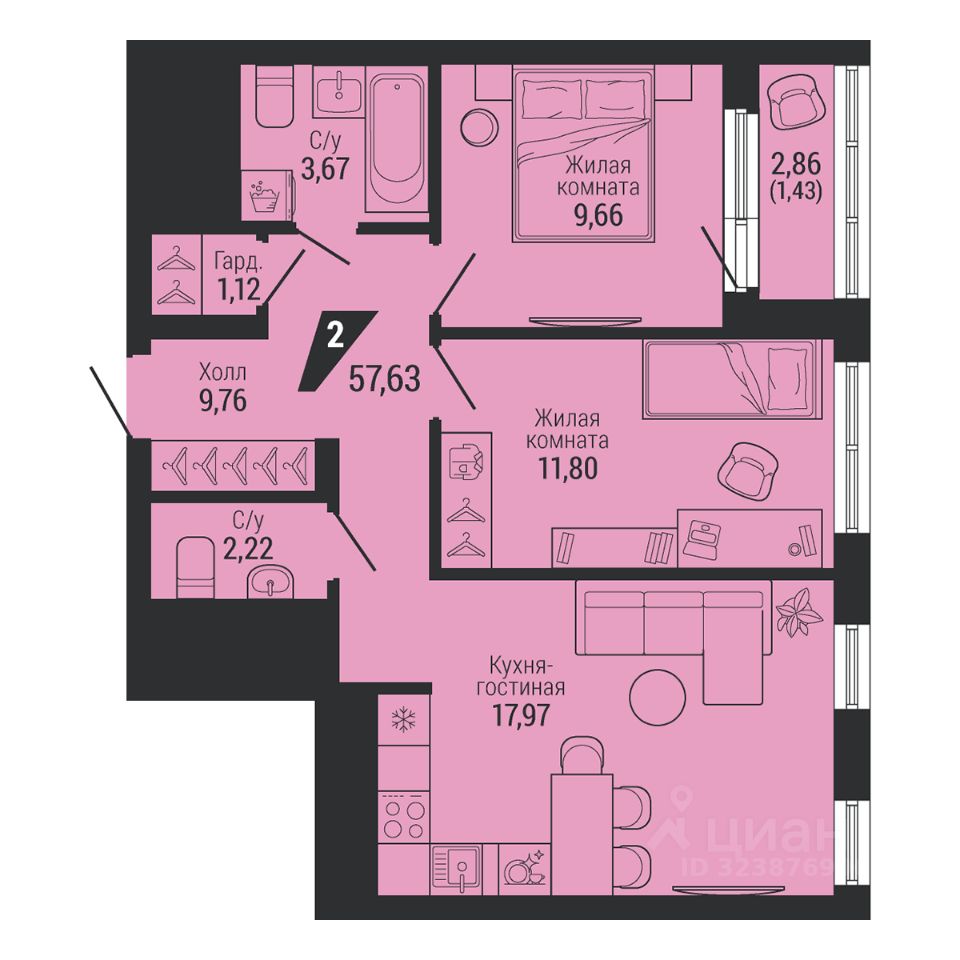 Общая площадь57,63 м2