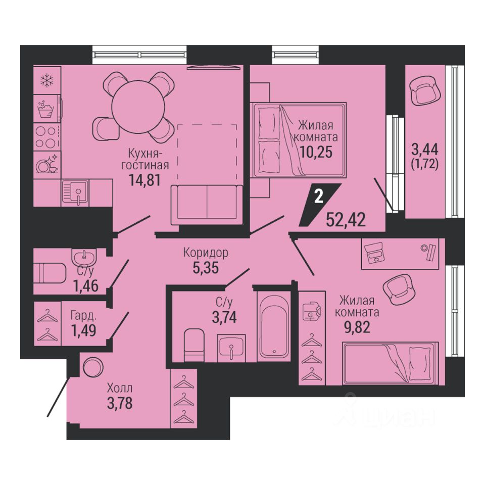 Общая площадь52,42 м2