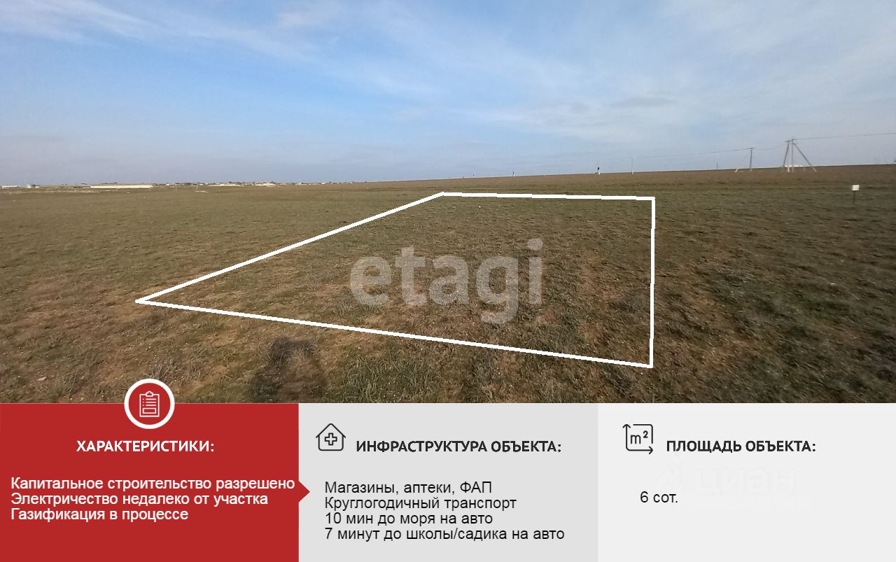 До моря — 10 минут на автомобиле. До ближайшей школы и детского сада 8 минут на автомобиле. В шаговой доступности от участка (1 км) ФАП, магазины первой необходимости, остановка общественного транспорта.