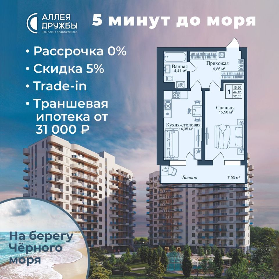 ''Аллея Дружбы'' — это комплекс апартаментов бизнес-класса в Евпатории, расположенный в 5 минутах прогулки от золотистых пляжей Чёрного моря. Два современных 12-этажных корпуса с панорамными видами на море объединены стильным стилобатом с центральным входом и бутиковыми retail-площадями, а закрытая территория и подземный паркинг обеспечивает приватность и безопасность.