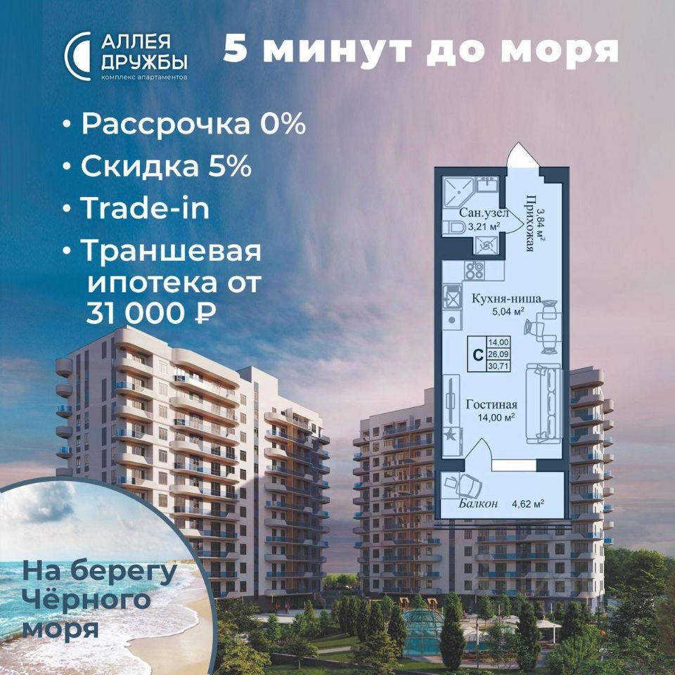 * 5 мин до моря пешком, планировки от 30 кв.м. * Высота потолков 3 м , предчистовая и чистовая отделка * Ипотека от СБЕРБАНКА * Доходность инвестиций от 30% годовых. * Сдача в аренду от управляющей компании (доверительное управление) позволяет получать доход от сдачи апартаментов без вашего участия * Безопасная сделка по ФЗ-214/эскроу-счёта