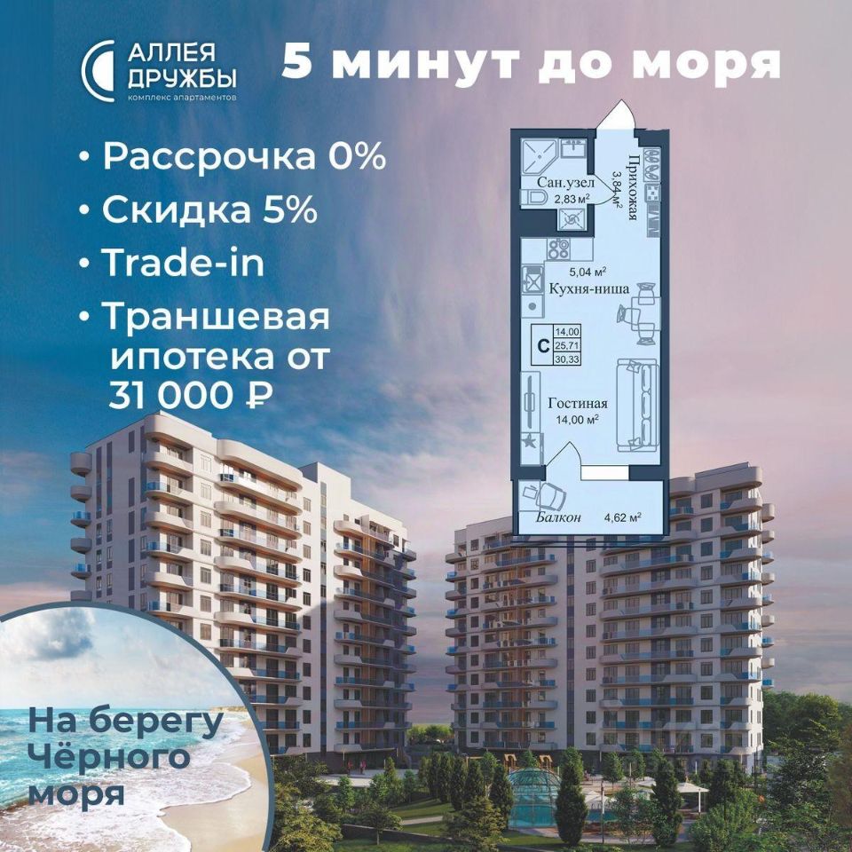 * 5 мин до моря пешком, планировки от 30 кв.м. * Высота потолков 3 м , предчистовая и чистовая отделка * Ипотека от СБЕРБАНКА * Доходность инвестиций от 30% годовых. * Сдача в аренду от управляющей компании (доверительное управление) позволяет получать доход от сдачи апартаментов без вашего участия * Безопасная сделка по ФЗ-214/эскроу-счёта