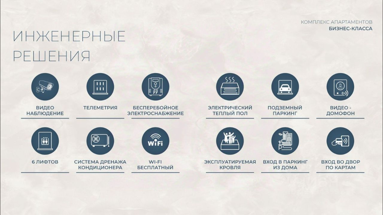 АРХИТЕКТУРА И КОНСТРУКТИВНЫЕ ОСОБЕННОСТИ: •12-этажное здание в авторском архитектурном стиле •Высота потолков (от 2,9 м до 3,1 м) •Эксклюзивное решение для первых этажей (высота потолков 3,4м) •Евро планировки с террасами и гардеробными •Панорамное ламинированное остекление •Индивидуальные келлеры •Видовые лоты на море •Высокоскоростные лифты по концепции 5* отеля •Предусмотрено резервное электроснабжение •По проекту предусмотрено место для кондиционера и практическое решение для маскировки коммуникаций