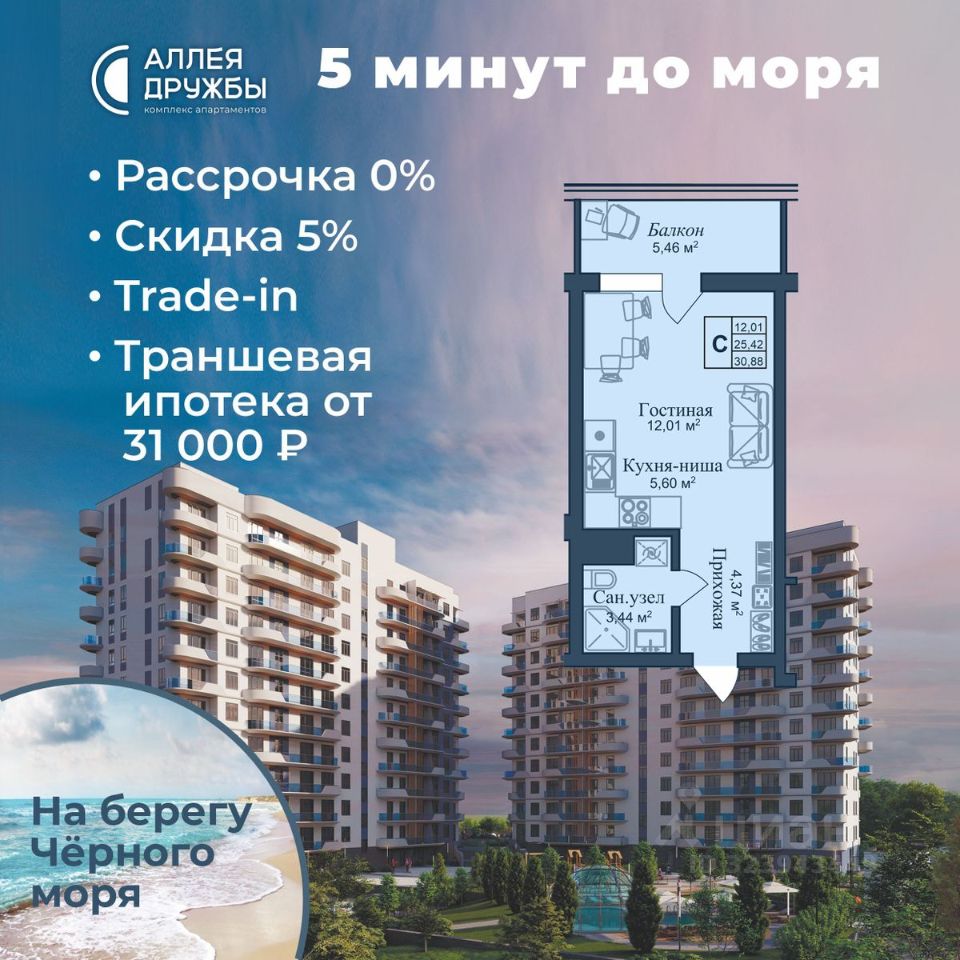 * 5 мин до моря пешком, планировки от 30 кв.м. * Высота потолков 3 м , предчистовая и чистовая отделка * Ипотека от СБЕРБАНКА * Доходность инвестиций от 30% годовых. * Сдача в аренду от управляющей компании (доверительное управление) позволяет получать доход от сдачи апартаментов без вашего участия * Безопасная сделка по ФЗ-214/эскроу-счёта