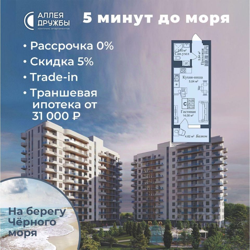 * 5 мин до моря пешком, планировки от 30 кв.м. * Высота потолков 3 м , предчистовая и чистовая отделка * Ипотека от СБЕРБАНКА * Доходность инвестиций от 30% годовых. * Сдача в аренду от управляющей компании (доверительное управление) позволяет получать доход от сдачи апартаментов без вашего участия * Безопасная сделка по ФЗ-214/эскроу-счёта