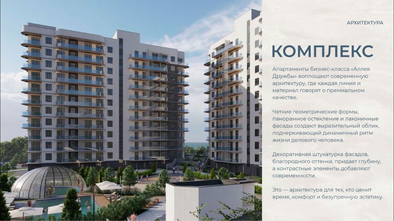 ''Аллея Дружбы'' — это комплекс апартаментов бизнес-класса в Евпатории, расположенный в 5 минутах прогулки от золотистых пляжей Чёрного моря. Два современных 12-этажных корпуса с панорамными видами на море объединены стильным стилобатом с центральным входом и бутиковыми retail-площадями, а закрытая территория и подземный паркинг обеспечивает приватность и безопасность.