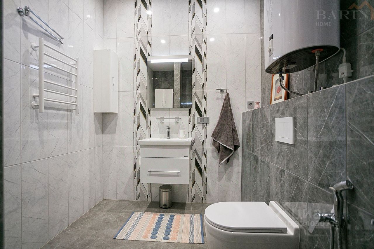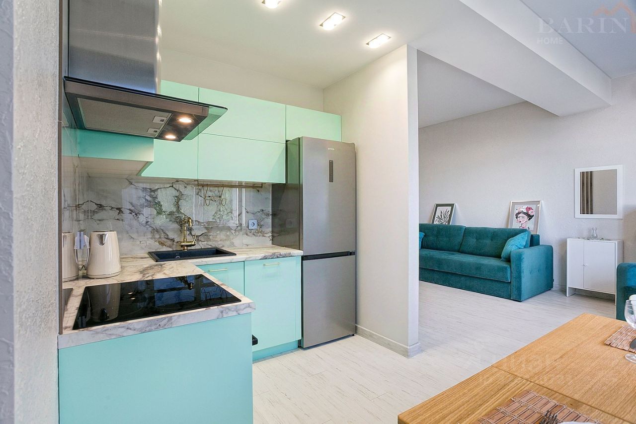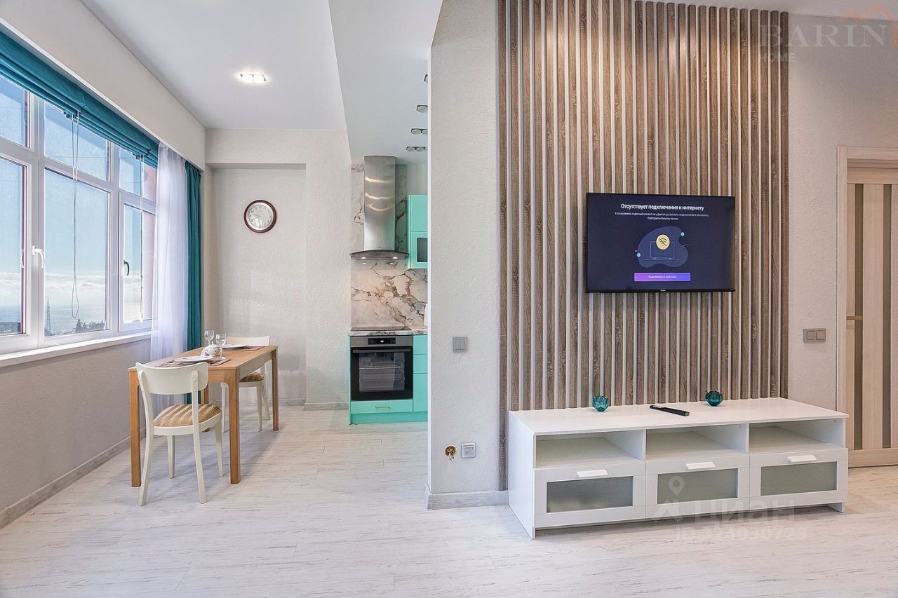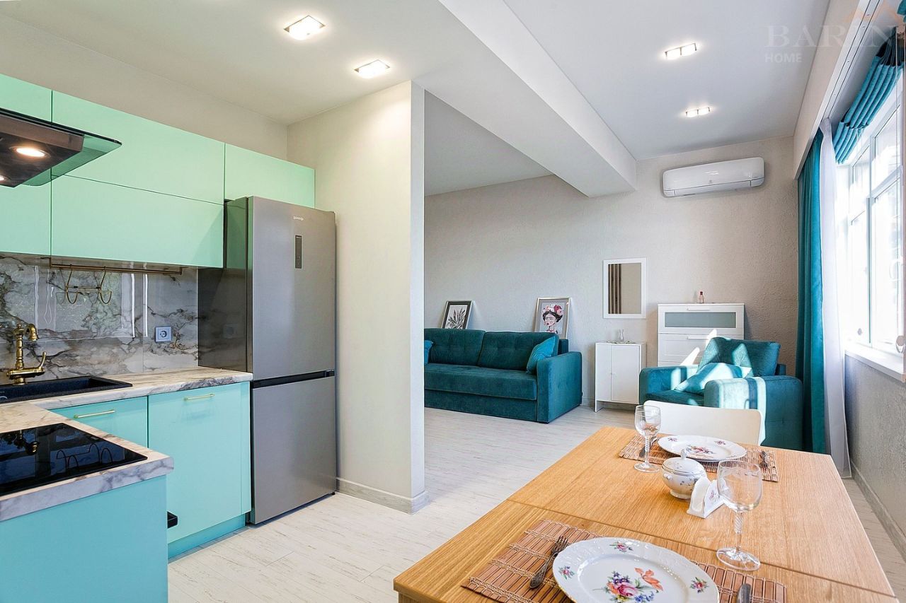 Из окон открывается боковой вид на море, боковой вид на горы и фронтальный вид на зелёный район, застроенный виллами. Квартира расположена на первом этаже, но первый этаж высокий. Под окнами огромная клумба, в которой высажены красно-книжные деревья и реликтовые многолетние кустарники. Клумба шириной 4 метра придаёт квартире дополнительное пространство. Если в клумбе высадить 4-5 пальм вид из окон на тропическую клумбу будет создавать дополнительное ощущение тропиков. В квартире выполнен новый ремонт, завершили делать ремонт летом 2025 года. Квартира полностью укомплектована мебелью и техникой, необходимой для комфортабельного проживания. В подъезде очень длинный коридор шириной в 2,8 метра, в котором можно установить встроенные корпусные шкафы как дополнительная система хранения вещей.