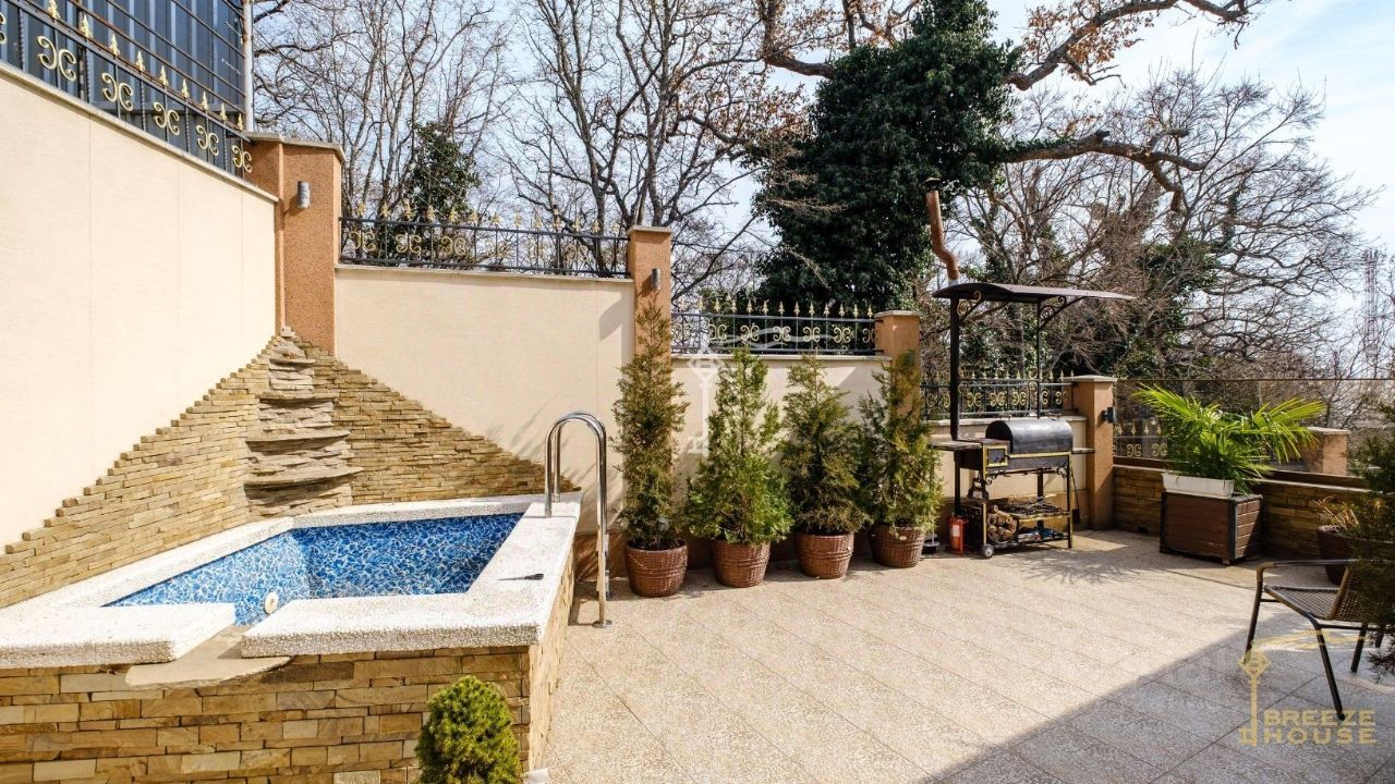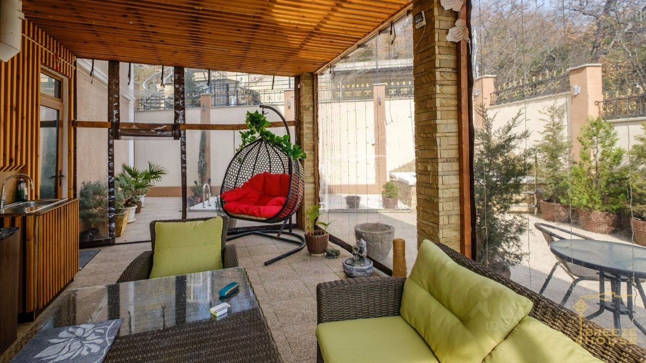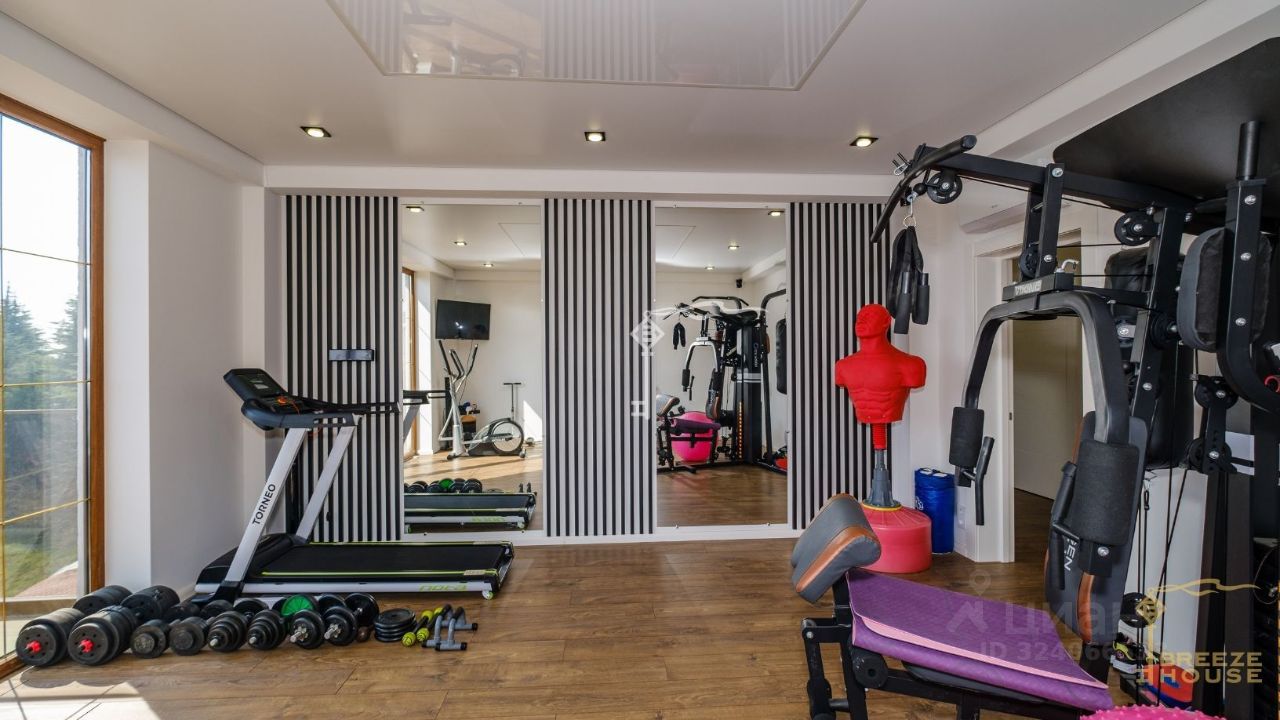 -Три этажа с качественной отделкой из премиальных материалов, включая деревянные ступени из ясеня с подсветкой. Железобетонный каркас, стены из ракушечника. -Современные технологии. Система ''умный дом'' с управлением через телефон, 6 телевизоров, музыкальная система Саунбар JBL, 7 кондиционеров, 4 холодильника, две стиральные машины, встроенные музыкальные системы в ванной комнате. -Просторные и функциональные помещения. 6 комнат, включая спортзал и бильярдную. Ванная с сауной, ведром-водопадом и выходом на бассейн. Гладильная комната, три гардеробные, котельная. -Электрический камин. Имитирует настоящий с паром без запаха. -Отопление и комфорт. На первом этаже — водяные теплые полы и стены, встроенные конвекторы, а также контурные подсветки. Есть автономный резервный генератор.