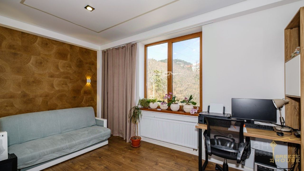 Предлагается к продаже элегантный 3-этажный дом с современным ремонтом и панорамным остеклением на закрытом участке 12 соток с гаражом и искусственным прудом с водопадом вблизи Ялты, в уютном поселке Восход, всего в 1 км от моря .