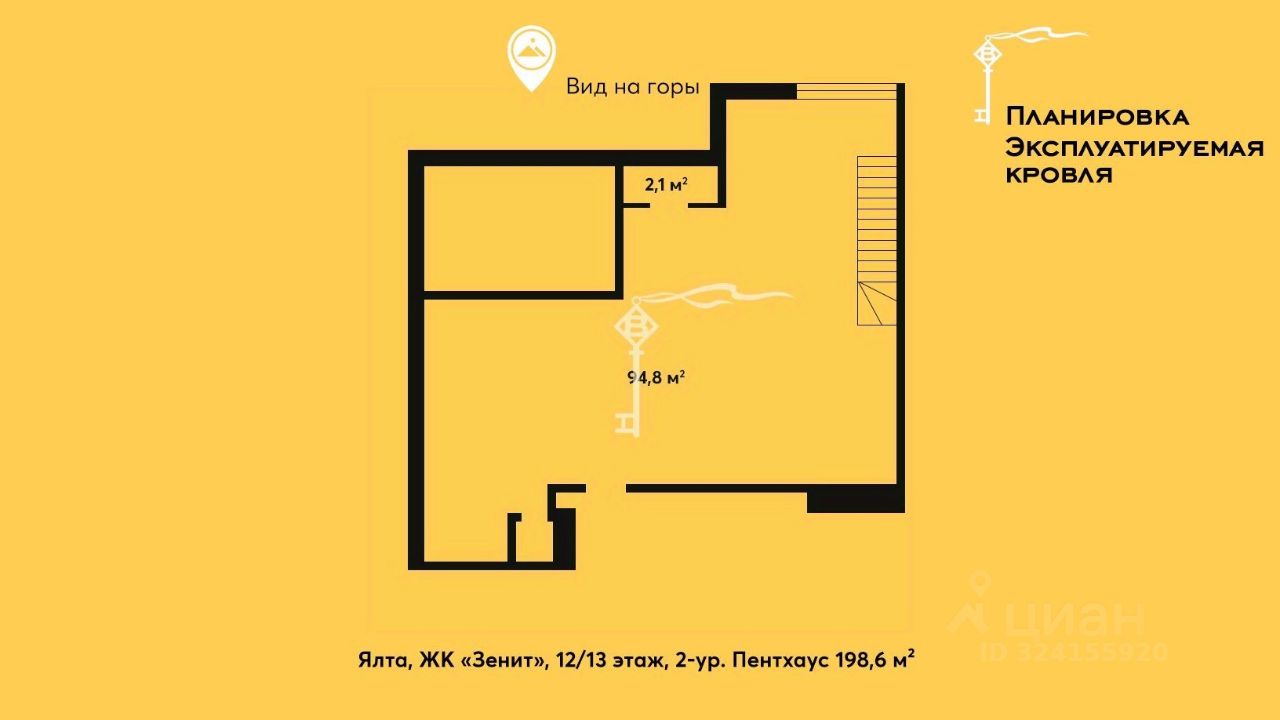 Двухуровневый пентхаус с теплым выходом на эксплуатируемую кровлю и панорамным остеклением с видом на Ялту и заповедник, расположенный в спальном районе Ялты в жилом комплексе комфорт-класса Зенит.