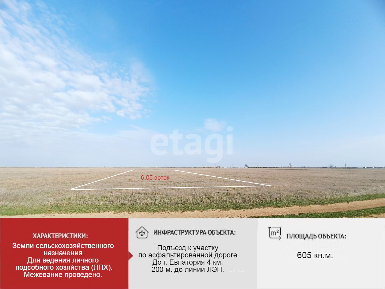 Земельный участок имеет правильную прямоугольную форму, относится к категории сельскохозяйственных земель с разрешенным видом использования — ведение личного подсобного хозяйства. До лини ЛЭП 200 метров, подключение к электросетям возможно по заявке в ресурсоснабжающую организацию. Подъезд к участку осуществляется по асфальтированной дороге.