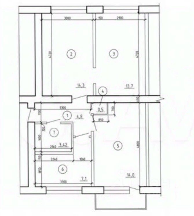 Общая площадь - 57 кв.м., жилые комнаты по 14 кв.м., две комнаты изолированные, одна проходная (можно сделать изолированной). Кухня - 7 кв.м., санузел совмещенный
