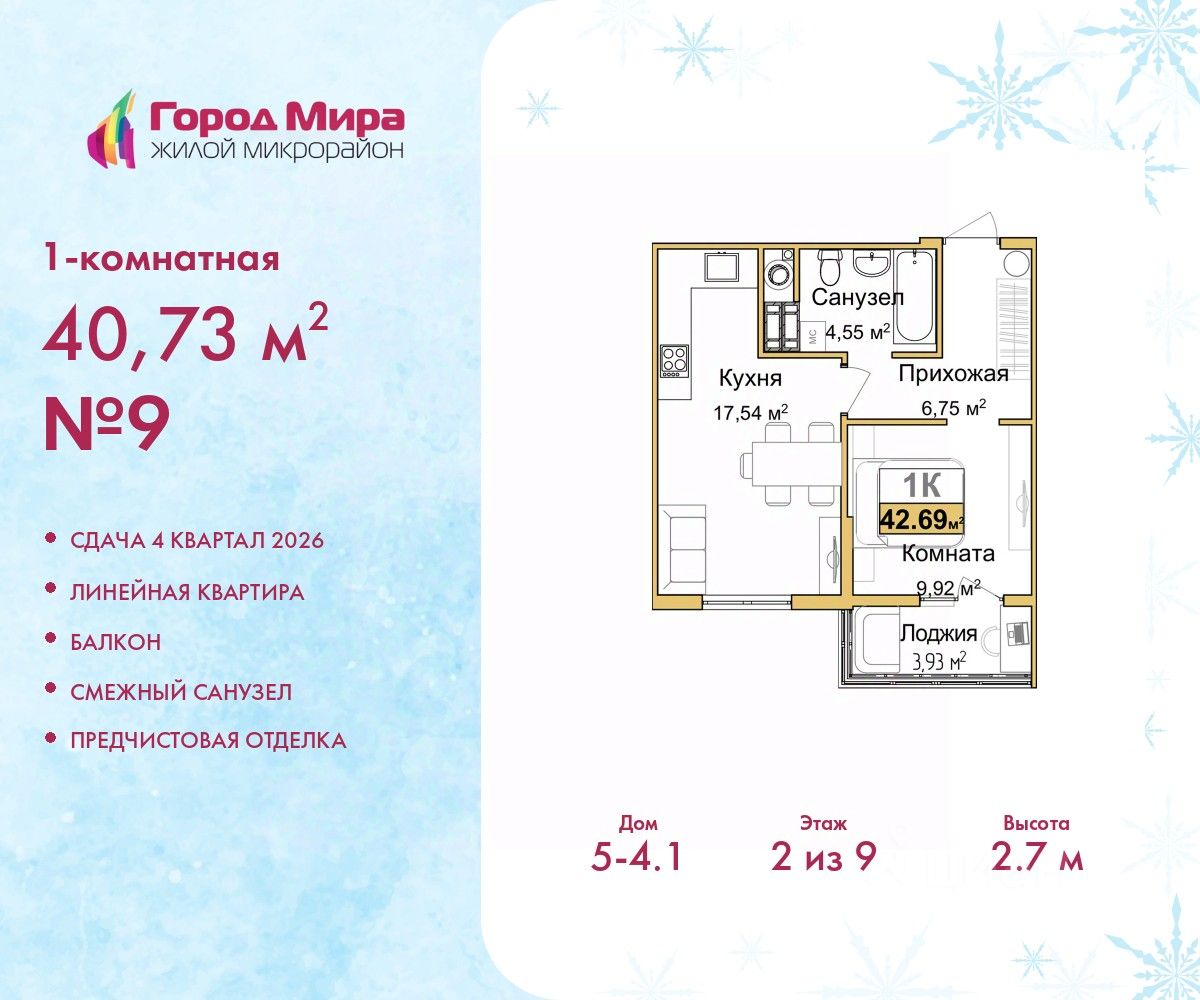 Просторная однокомнатная квартира с предчистовой отделкой в ЖМ ''Город Мира'' на 2 этаже. Общая площадь: 40.73 кв.м., жилая: 9.92 кв.м., площадь просторной кухни-столовой: 17.54 кв.м. Все окна выходят на одну сторону. В квартире один балкон, один совмещенный санузел. Высота потолков 2.7 м.