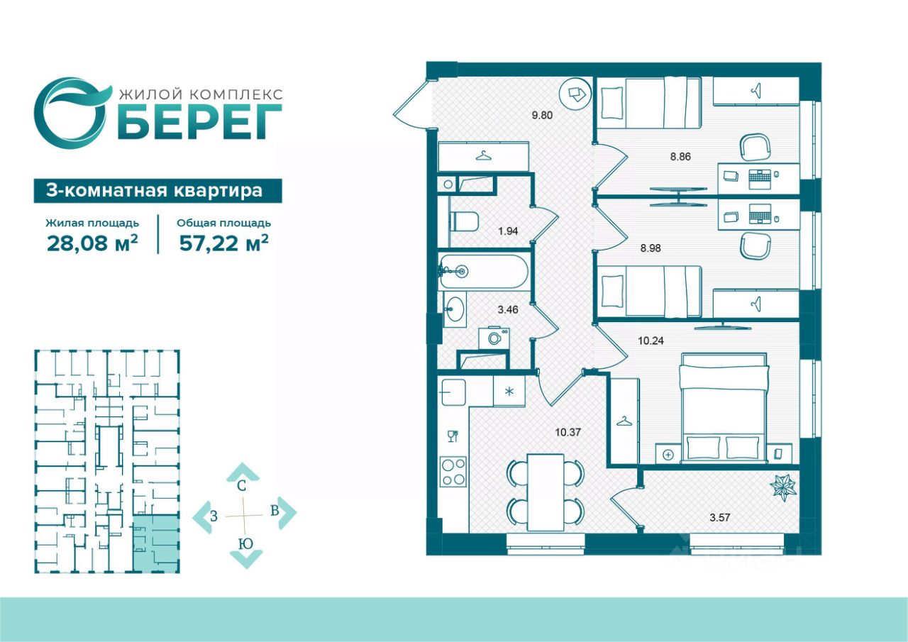 Продаётся 3-комнатная квартира в строящемся доме (поз.2), срок сдачи: IV-кв. 2027, общей площадью 57.22 кв.м., на 3 этаже. Современный жилой комплекс ЖК ''О' Берег'' на ул. Флотской, воплощает идею комфортной, доступной и продуманной городской среды. Комплекс расположен вблизи набережной, в экологически благоприятной зоне города. Панорамный вид на воду и зелёные аллеи усиливают ощущение уюта и создают атмосферу природной гармонии прямо в черте города.