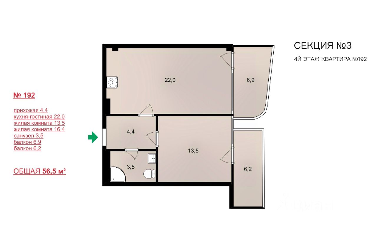 Общая площадь56,5 м2