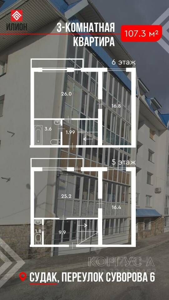 Характеристики: - площадь квартиры 107,3 м2, из них кухня-гостиная - 25,2 м2, спальни - 26 м2, 16,8 м2 и 16,4 м2, - два санузла, - 2 балкона с видом на море, - дом введен в эксплуатацию в 2014 году.