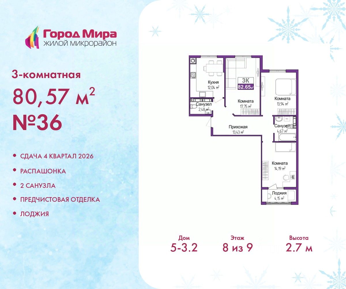 Просторная 3-комн. квартира с предчистовой отделкой в ЖМ ''Город Мира'' на 8 этаже. Общая площадь: 80.57 кв.м., жилая: 45.88 кв.м., площадь просторной кухни-столовой: 12.04 кв.м. Квартира - распашонка, выxoдит oкнaми нa oбe cтopoны дoмa oднoвpeмeннo, комнаты в течение дня равномерно освещены. В квартире одна лоджия, один совмещенный и один раздельный санузел. Высота потолков 2.7 м.