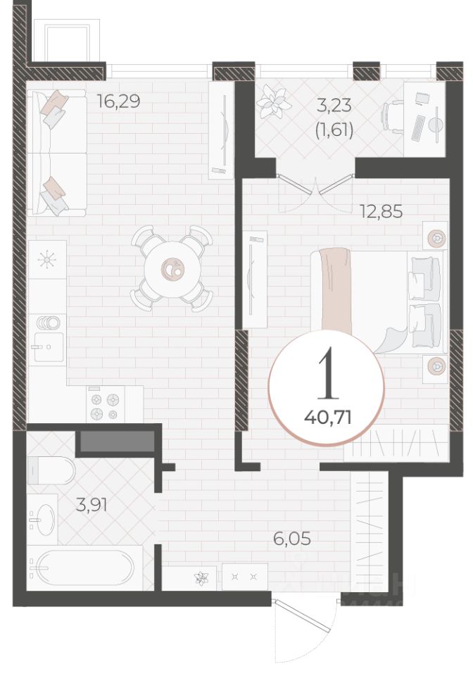 Общая площадь40,71 м2