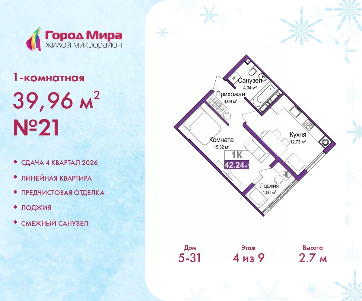 1-комн. квартира от застройщика с предчистовой отделкой в ЖМ ''Город Мира'' на 4 этаже. Общая площадь: 39.96 кв.м., жилая: 15.32 кв.м., площадь просторной кухни-столовой: 12.73 кв.м. Все окна выходят на одну сторону. В квартире одна лоджия, один совмещенный санузел. Высота потолков 2.7 м.