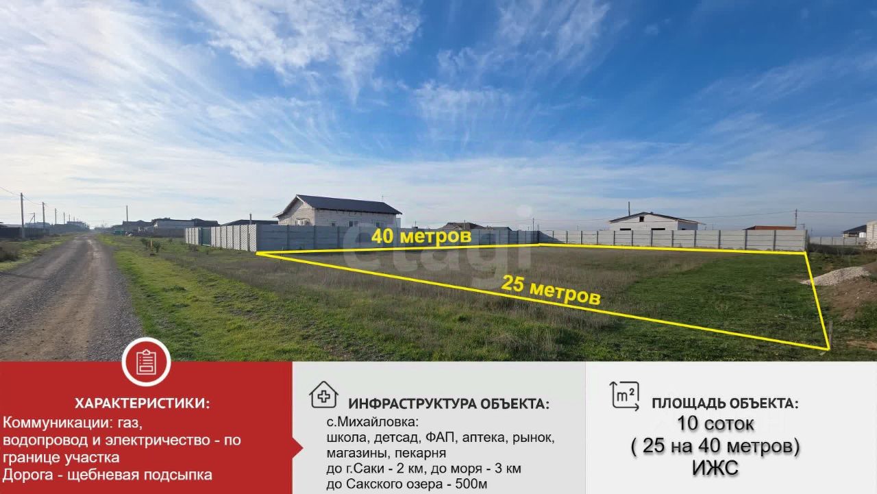 Отличная локация: * новый, развивающийся массив (многие соседи строятся либо уже живут в своих домах) * в 200 метрах небольшой лесок, а в 500 метрах знаменитое Сакское соленое озеро с лечебной грязью! * в с.Михайловка присутствует вся необходимая инфраструктура: школа, детсад, амбулаторий, аптека, рынок, пекарня, магазины, церковь и мечеть... * в 4 км оборудованный пляж на одном из лучших побережье Черного моря * 2 км до курортного города Саки, 25 км до г.Евпатория, 45 км до г.Симферополь