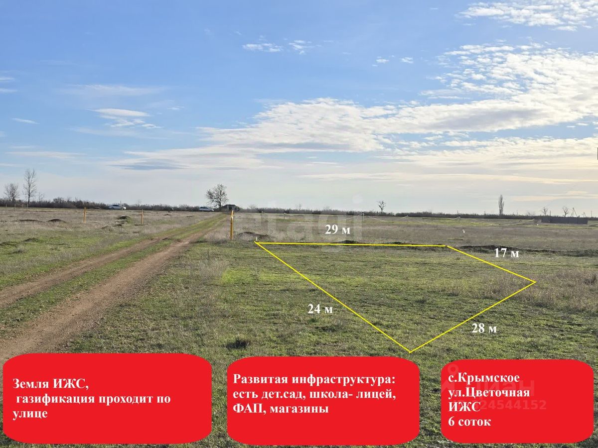 В 400 м от центра села Крымское продается земельный участок 6 соток по ул. Цветочная. Участок находится в новом массиве. Размером 29*17*28*24 м. Вид разрешенного использования: индивидуальное жилищное строительство : земли населенных пунктов. Можно строить дом своей мечты. В селе Крымское развитая инфраструктура, отличное транспортное снабжение. В селе есть школа-лицей, детский сад, много магазинов, большая парковая зона. Дороги в селе асфальтированы, в центре села автобусная остановка. Отличное место для постройки дома мечты. Расстояние от г.Саки 21 км, от Евпатории 23 км, г.Симферополь 40 км., до трассы Таврида 4км, до жд станции Яркая 1,5км. Еще есть термальный источник в 5 км от села Крымское. Звоните, я вам расскажу об участке и о селе .