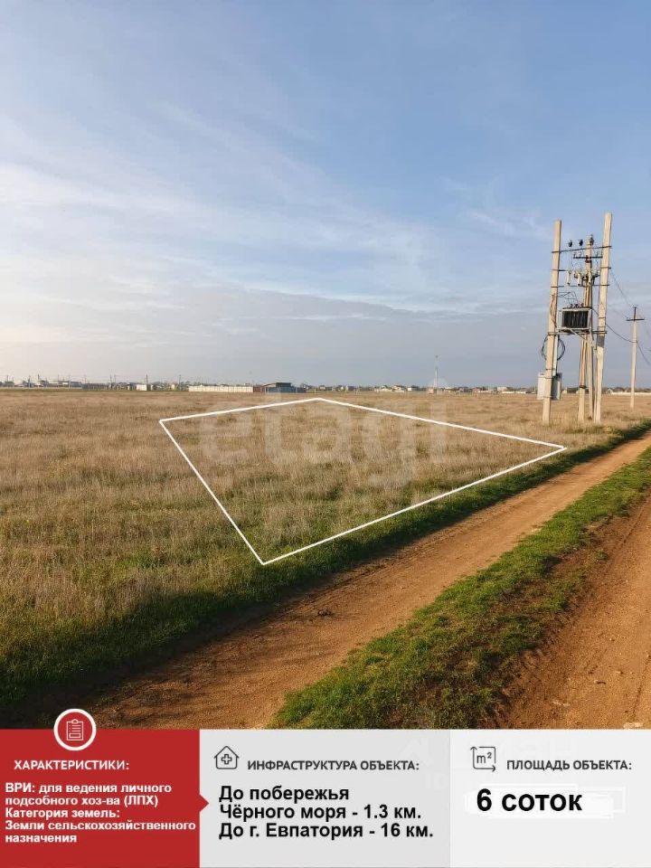 До города Евпатория всего 16 км. Участок имеет круглогодичный доступ и активно развивающуюся инфраструктуру. Имеет смежный участок, который тоже продаётся.