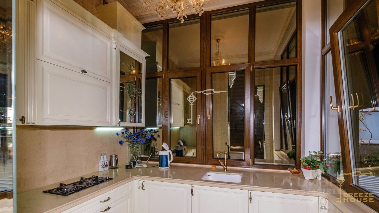 Внутреннее пространство оформлено в светлых, спокойных тонах, выполнен дизайнерский ремонт. Высокие потолки усиливают ощущение воздуха и света, создавая комфортную атмосферу.
