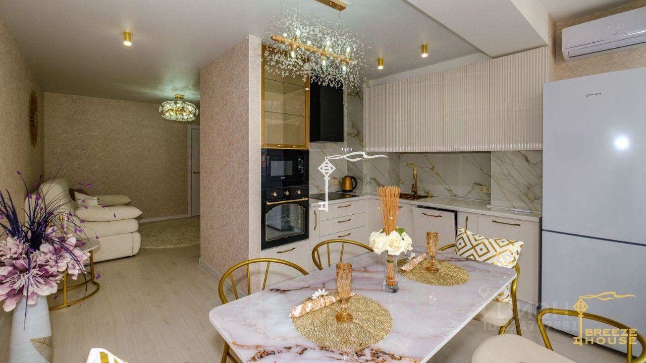 Интерьер выдержан в спокойной естественной цветовой гамме, использованы качественные отделочные материалы, из окон виды на горы и город. Квартира полностью оборудована всей необходимой мебелью и техникой.