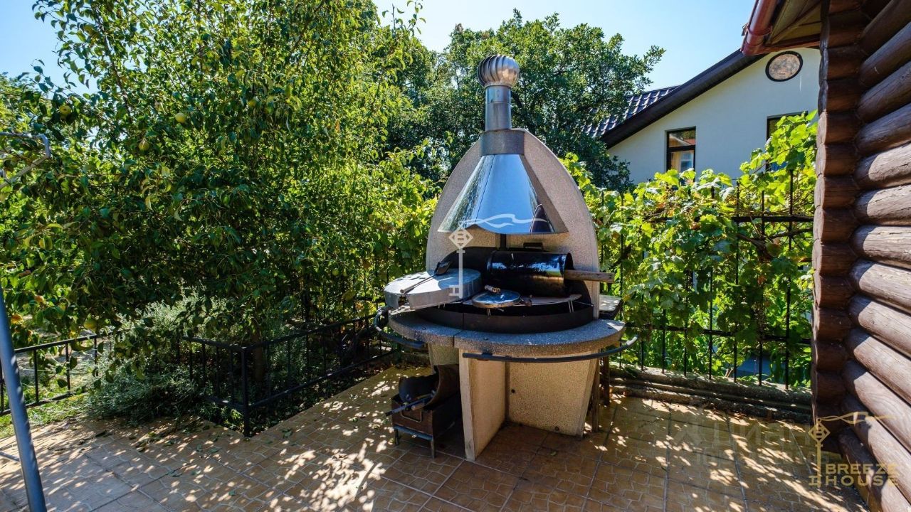 В глубине сада — уютная гриль-зона и большая беседка из дерева, закрывающаяся роллетами, чтобы даже зимой вы могли наслаждаться атмосферой уюта.