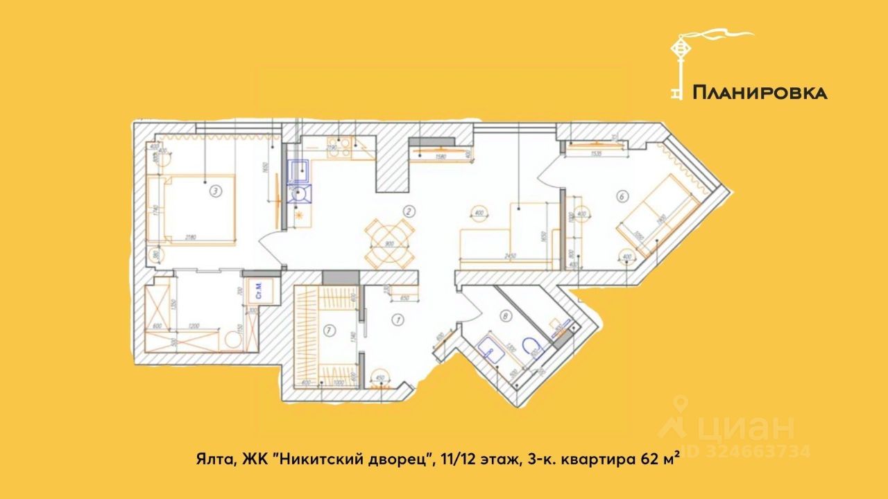 Продается стильная квартира площадью 62,1 м² с открытым видовым балконом 18 м² на 11 этаже 12-этажного дома премиального комплекса ''Никитский дворец'' в пгт. Отрадное, рядом с Ялтой.