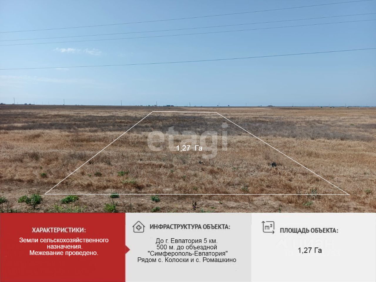 Земельный надел расположен в непосредственной близости от транспортной развязки ''Симферополь-Евпатория'' (500 м.). Населенные пункты рядом: с. Колоски, с. Ромашкино. До г. Евпатория 5 км по асфальтированной дороге.