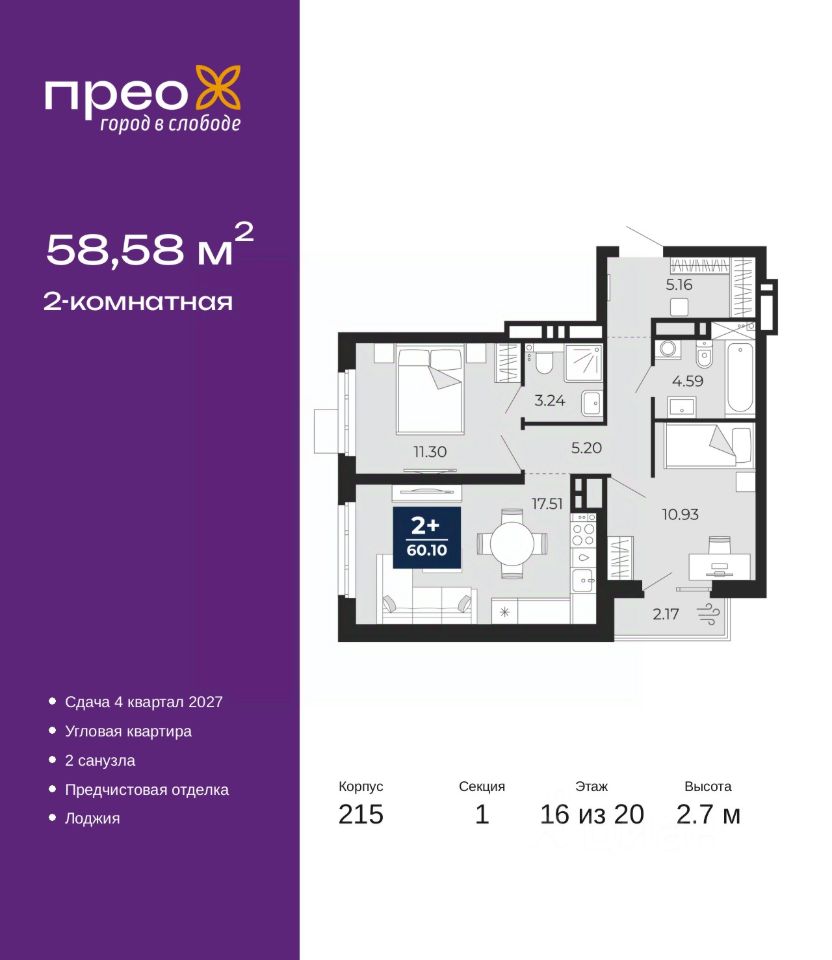 Продается двухкомнатная квартира с предчистовой отделкой в ЖК ''Прео'' на 16 этаже. Общая площадь: 58.58 кв.м., жилая: 22.23 кв.м., площадь просторной кухни-столовой: 17.51 кв.м. Квартира угловая, идеально подойдет любителям тишины и панорамных видов. В квартире одна лоджия, два совмещенных санузла. Высота потолков 2.7 м.